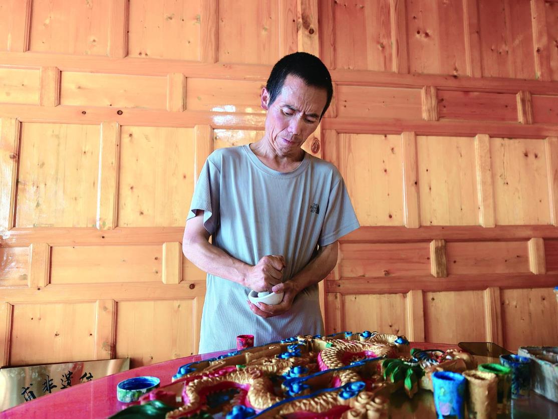 看到有客人進來,多杰才旦連忙放下手中的畫筆,饒有興趣地帶領大家參觀他的得意之作。“這是用于裝飾的神龍圖案,這邊還有梅、蘭、竹、菊‘四君子’玻璃鋼擺件,這是藏族傳統的吉祥八寶泥塑……”