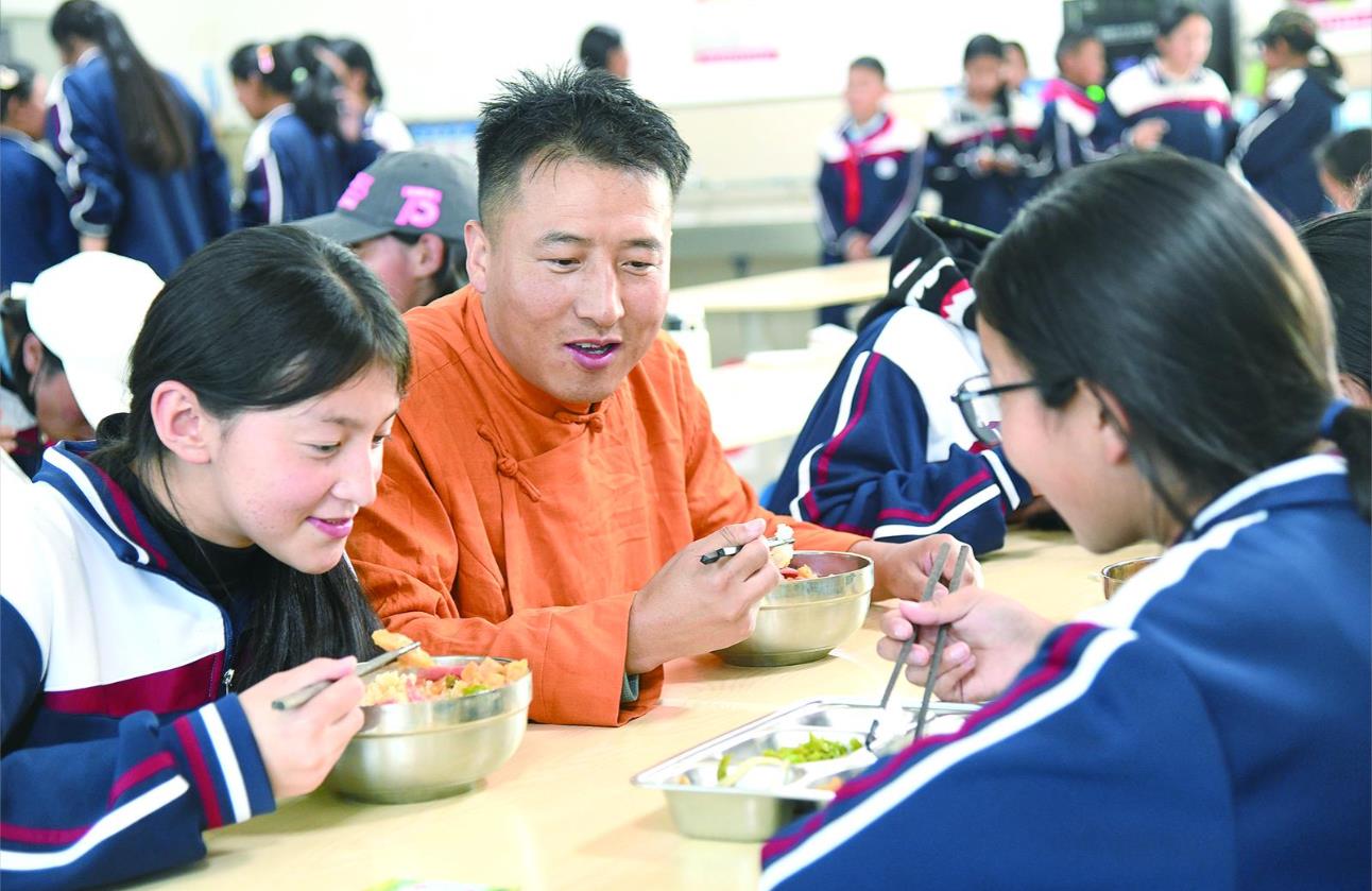 晚餐時刻,多杰老師于餐桌間,詢問學生是否習慣學校的飯菜,用細微的關懷傳遞著溫情,讓遠離家鄉的新生感受到了家的溫暖。