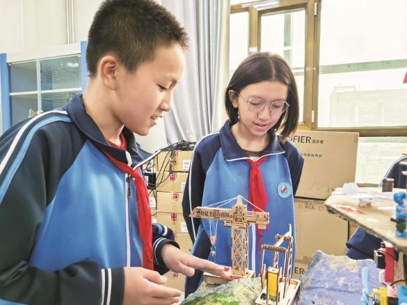 “這里是礦產(chǎn)資源研發(fā)及開采區(qū)和生活休閑游樂區(qū)。”學(xué)生們介紹著家鄉(xiāng)的美景。沙盤上幾臺采挖機來回轉(zhuǎn)動,旁邊的娛樂區(qū)播放著動聽的歌曲。