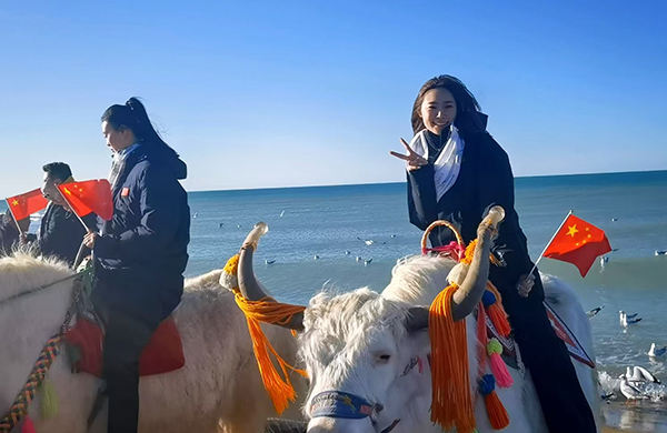 花樣游泳冠軍王賜月說:“牦牛身上的毛發沒有一絲雜色,犄角和鬃毛上還有喜慶漂亮的裝飾,性格非常溫順,跟它們合影真的很開心。感覺在這里,人和動物們、和大自然相處很和諧。”