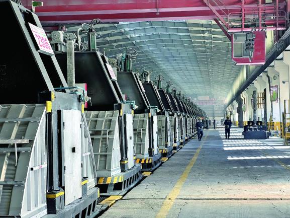 通過抬包運輸車,熱氣騰騰的鋁液直接進入駐廠或鄰近的近10家鋁加工合作企業,企業之間實現無縫銜接協同生產,這樣可以省去鋁液鑄錠工序,高效完成綠電鋁就地轉化,減少轉化過程碳排放,目前就地轉化率達84%。