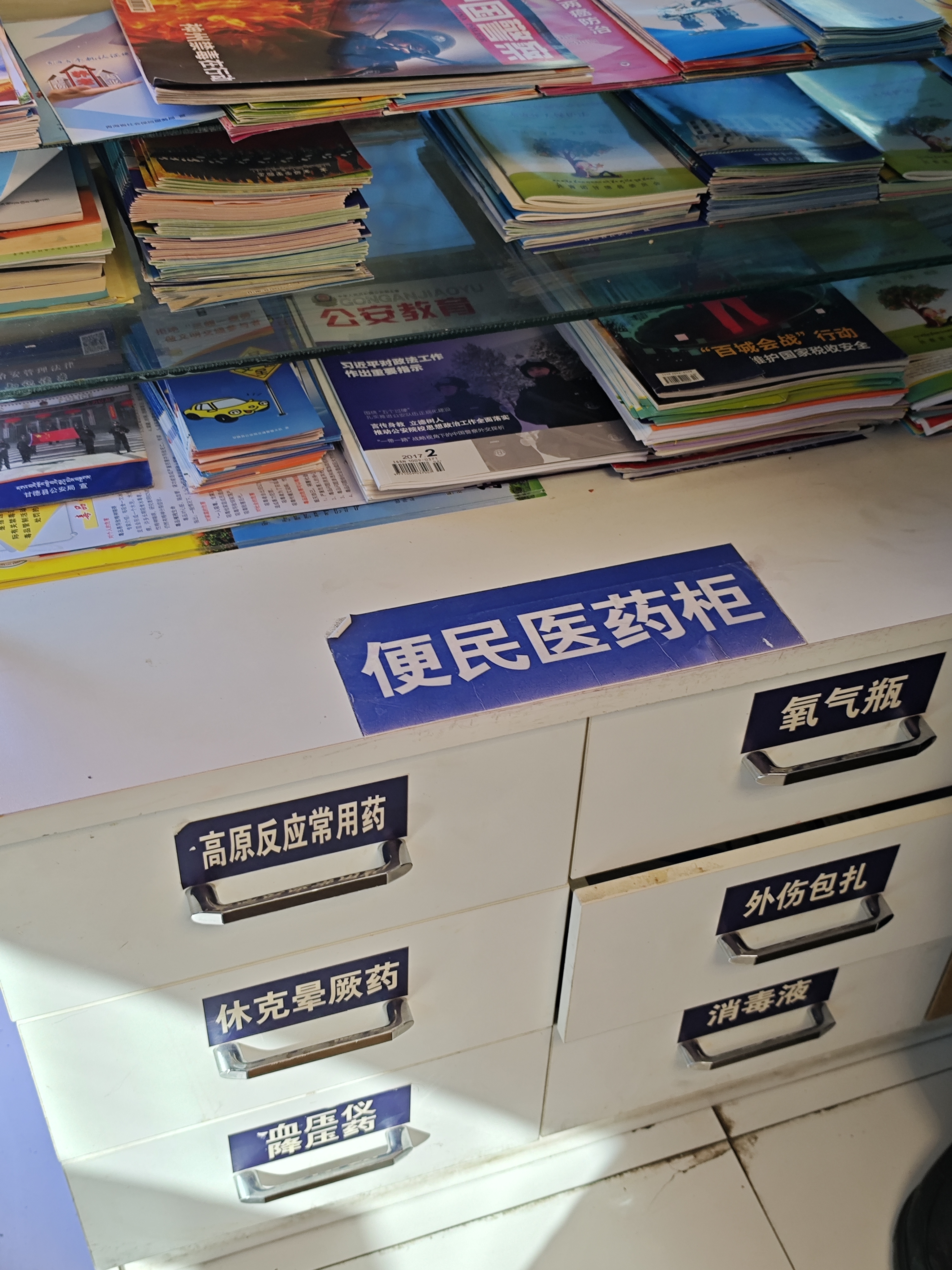 “這里也是一個簡易的醫療救助點。由于甘德縣城海拔4020米,屬于高原地區,加之每年的四月至十月期間外來務工人員及旅游人員眾多,難免出現高原反應等其他疾病。派出所廣場警務站作為聯系群眾的紐帶,配備了應對高原反應的藥物如紅景天等,配備的這些簡易醫療設備可以暫時幫助群眾接受藥物治療,緩解身體不適,截至目前共發放價值6000余元的藥物。”馬明旭說。