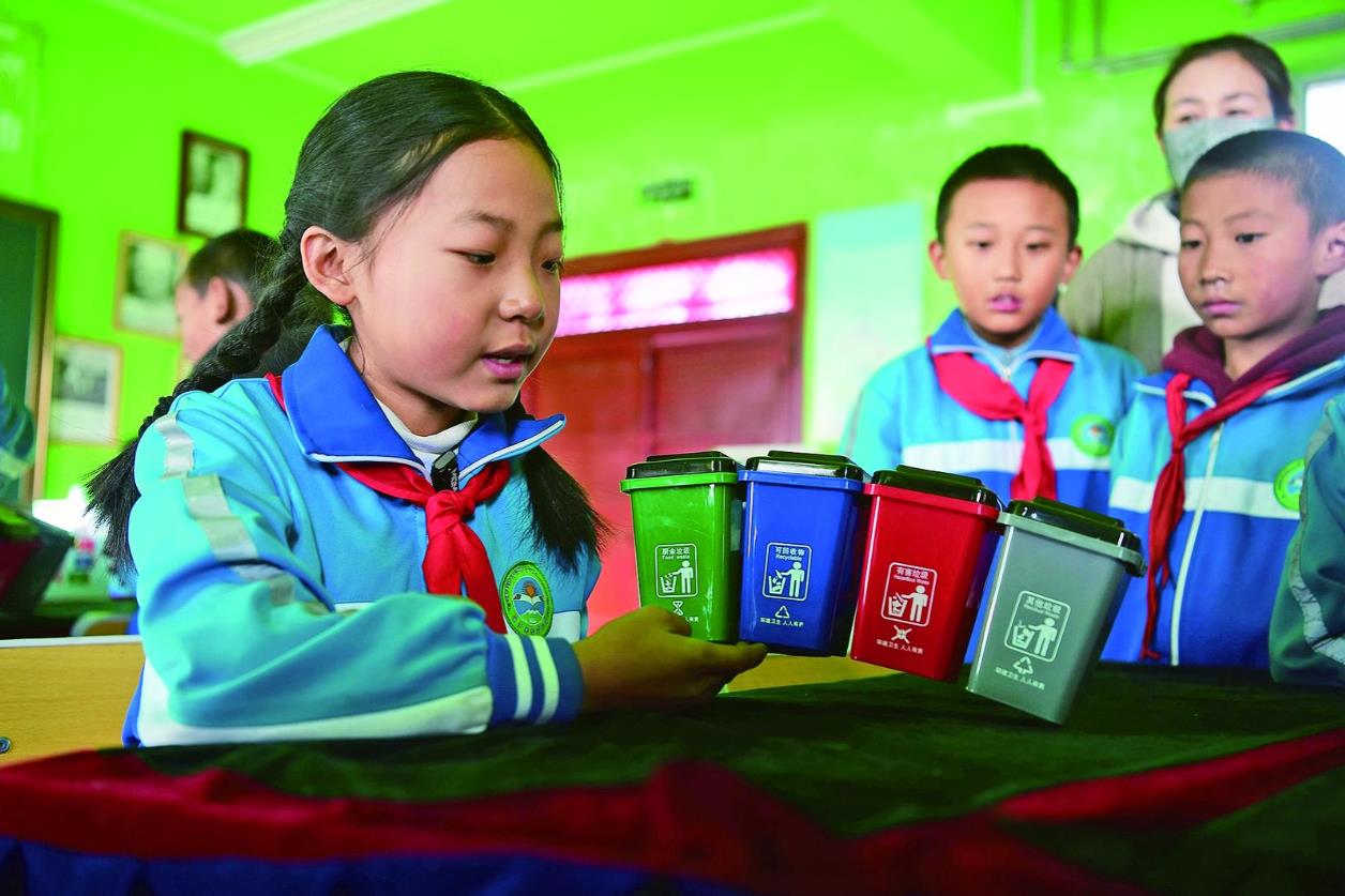 11月14日下午,玉樹(shù)藏族自治州治多縣吉尕小學(xué)內(nèi),三年級(jí)(4)班的學(xué)生在三江源國(guó)家公園園區(qū)青少年生態(tài)道德教育基地開(kāi)展生態(tài)課程,老師教學(xué)生如何開(kāi)展垃圾分類,學(xué)生動(dòng)手實(shí)踐,將不同的垃圾進(jìn)行分類。