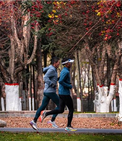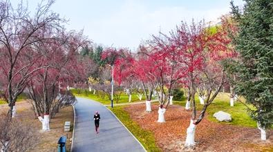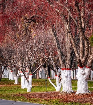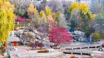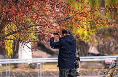 海棠公園中,湛藍的天,襯著那一串串紅彤彤,再搭配著黃綠色的楊柳、紅色楓葉,遠近各色的景色交錯映入眼簾,為冬日的西寧增添了獨特的魅力。