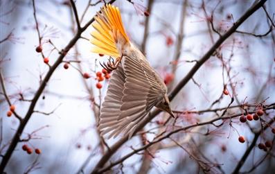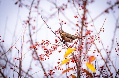 “粒粒丹珠綴滿枝,尋香蝶雀恐來遲。”走進初冬的海棠公園,紅彤彤的海棠果綴在枝頭,煞是喜人。冬日海棠果似花似火,點綴著枝頭呈現出萬點紅的景象。經過霜雪的浸潤,海棠果紅得如火如荼,一顆顆像紅瑪瑙般,晶瑩剔透、精致玲瓏,成為了冬日里的一道亮麗風景線。