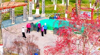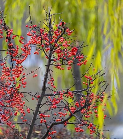 在一棵海棠樹下坐坐,陽光曬暖著背,頭頂來往的鳥兒格外熱鬧,它們嘴里噙著果子,在樹枝間跳動,安詳地享受著這份果實的富足。暖陽穿過“紅果樹”的縫隙灑在地面,紅色的步道上人們悠閑地散步、慢跑。拿起相機,對好焦距、取好景,鏡頭里垂柳或黃或綠,假山間紅亭廊閣古色古香,再取上一株伸向鏡頭掛滿果子的海棠,一幅冬日海棠美景被瞬間定格。