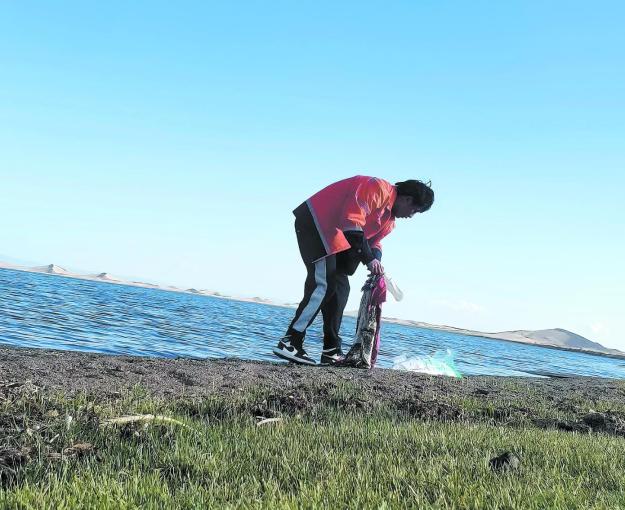 甘子河鄉熱水村生態員桑日杰東智布,剛參加完村里的會議,就往他負責的巡護區域走去。他的區域靠近青海湖邊,他邊走邊拿著袋子將見到的垃圾撿起,等返回來的時候再撿一遍。
