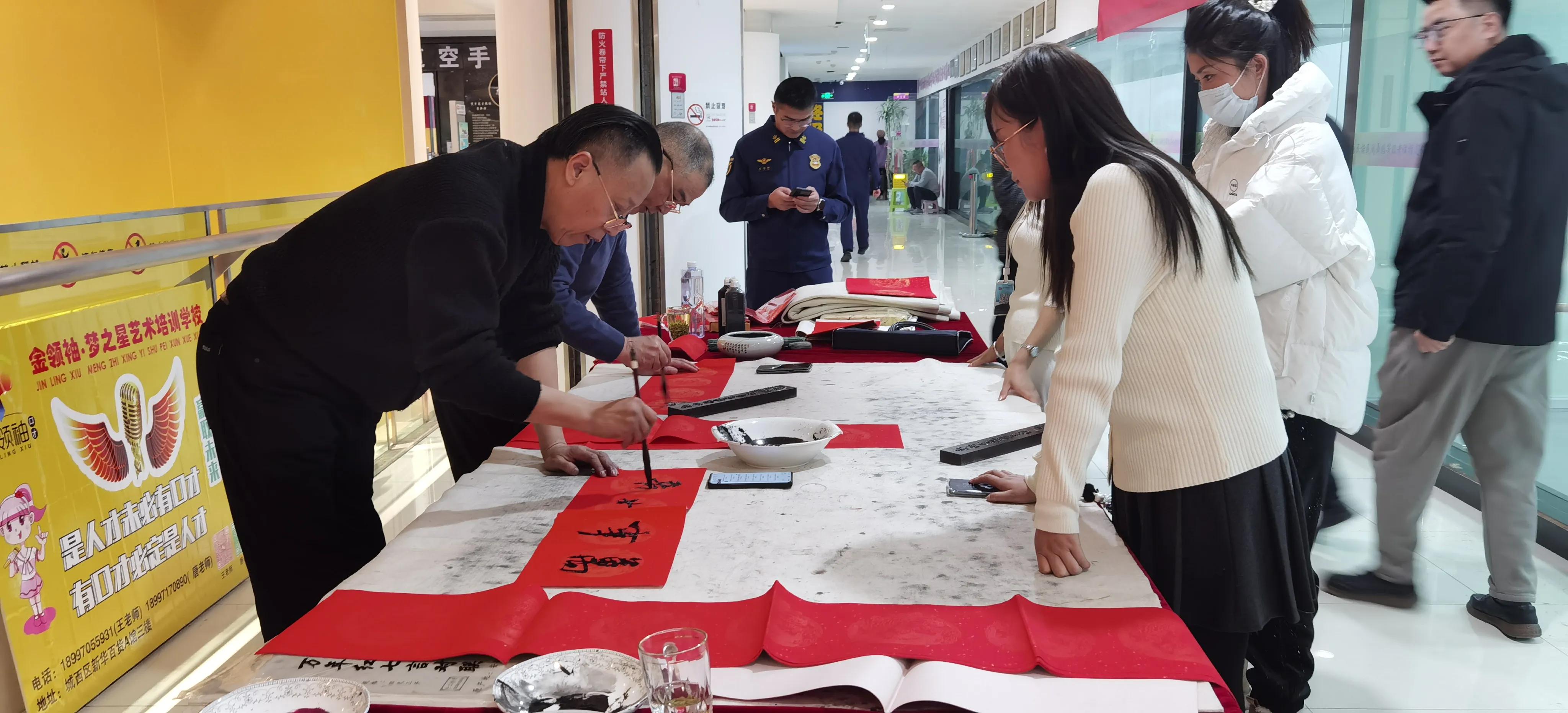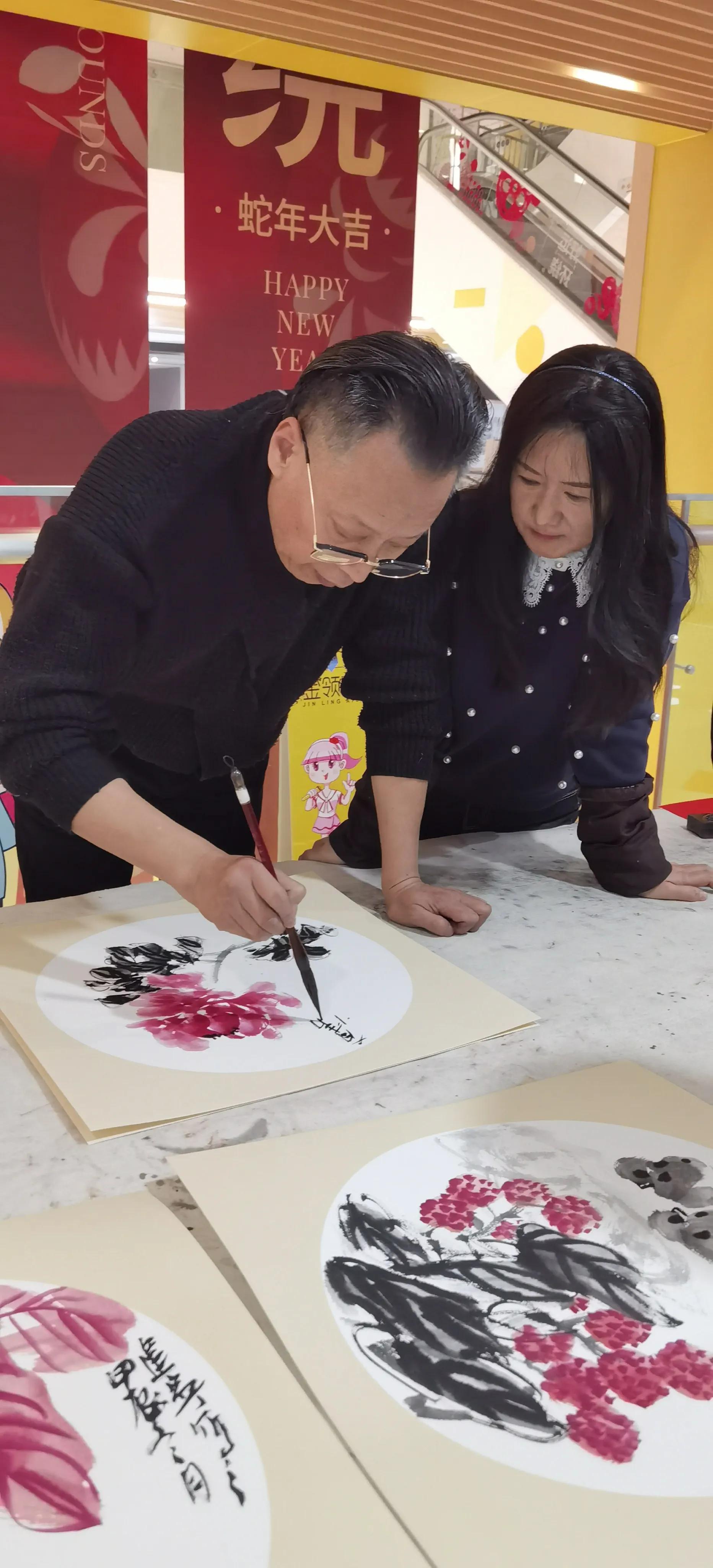 活動中,他們現(xiàn)場揮毫潑墨,書寫春聯(lián)與“福”字。春聯(lián)作為春節(jié)文化的重要符號,承載著數(shù)千年的歷史傳承,自漢朝起源,以紅底黑字或金字的鮮明搭配,傳遞著對新年幸福、健康、財富、和諧等美好愿景的期盼。書法家們精湛的技藝在筆鋒游走間展露無遺,墨香四溢,一張張“福”字飽含深情,一副副春聯(lián)滿是祝福,讓現(xiàn)場充滿了濃郁的年味,讓人們提前感受到春節(jié)的喜慶與溫馨,也讓傳統(tǒng)文化在現(xiàn)代都市的商業(yè)空間中煥發(fā)出新的生機(jī)與活力,為新春佳節(jié)增添了一抹亮麗的文化色彩,更讓在場觀眾領(lǐng)略到傳統(tǒng)藝術(shù)與節(jié)日文化完美融合的獨特魅力。