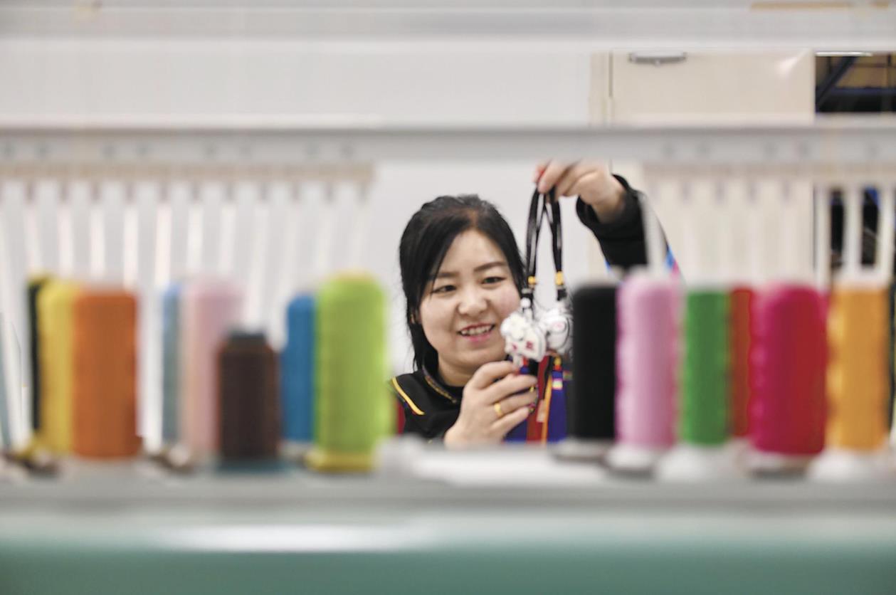 1月20日,在海東市互助土族自治縣青繡(盤繡)產業基地自動化傳統土族刺繡車間,工人正在忙碌地生產青繡產品。近年來,互助縣大力挖掘傳統手工技藝資源,引導繡娘就業創業,促進民眾穩定增收。