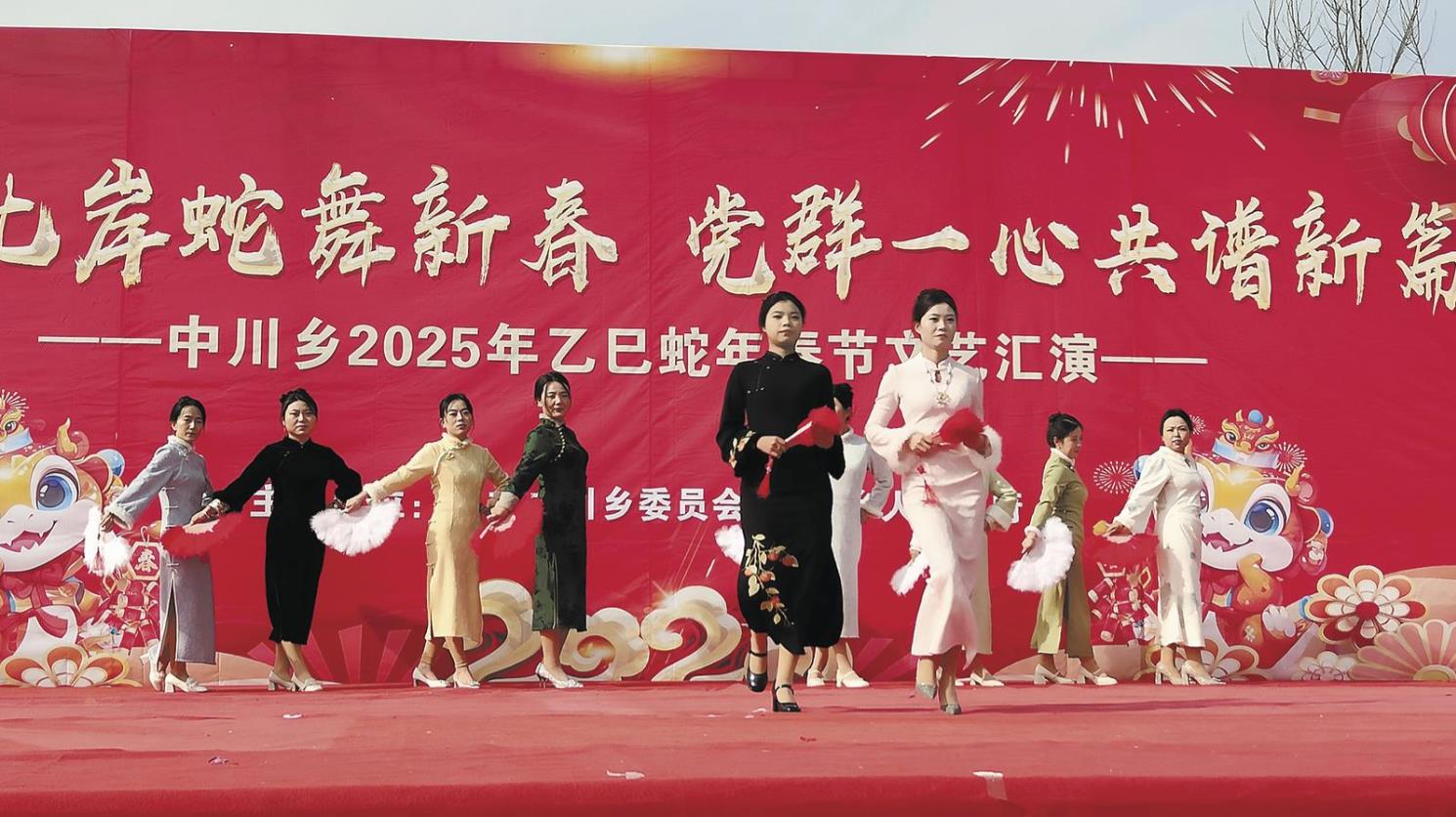 各村表演隊身著鮮艷的服裝,用精彩的歌舞、詩朗誦、旗袍走秀等形式,展現著中川各族兒女對新春的美好期盼,訴說著他們對新生活的無限熱愛。臺下掌聲、歡呼聲不斷,一次次將演出氣氛推向高潮。