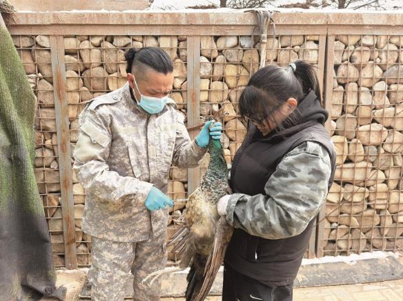1月31日,正月初三,西寧野生動物園的趙海龍剛給生病的孔雀注射了一劑藥。