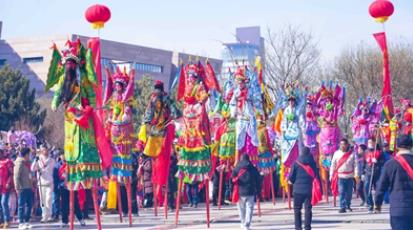 “瞧!高蹺隊來了……”踏著傳統(tǒng)的鼓點,由61人組建的大型高蹺隊踩著節(jié)奏上場了,演員們扮上各種角色,扭動著身姿,將現(xiàn)場氛圍推向高潮。現(xiàn)場群眾喝彩聲不斷,紛紛舉起手機記錄這熱鬧喜慶的一幕,整個現(xiàn)場沉浸在一片歡樂祥和的氛圍中。
