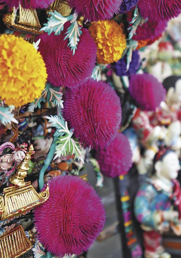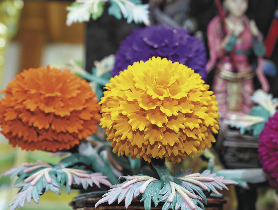 每年的農(nóng)歷正月十五,是塔爾寺一年一度的酥油花展。酥油花是以酥油為主要原料制作而成的雕塑藝術(shù),每個酥油花造型題材多樣,內(nèi)涵豐富。作為首批列入國家級非物質(zhì)文化遺產(chǎn)名錄的技藝,不論是造型、制作還是色彩搭配,無一不體現(xiàn)著制作者的塑形能力,也因此,酥油花制作被稱為指尖上的技藝。栩栩如生的造型,豐富多彩的色彩搭配,讓游客流連忘返,發(fā)出聲聲贊嘆。圖為2月11日,在塔爾寺內(nèi)制作好的酥油花擺放整齊等待展出。