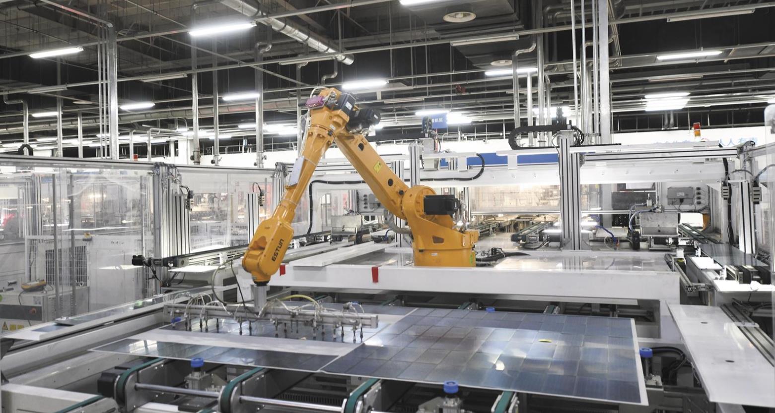 天合光能組件生產(chǎn)車間,一條條生產(chǎn)線開足馬力,機(jī)器人自動組件方陣排版,全力沖刺“開門紅”。