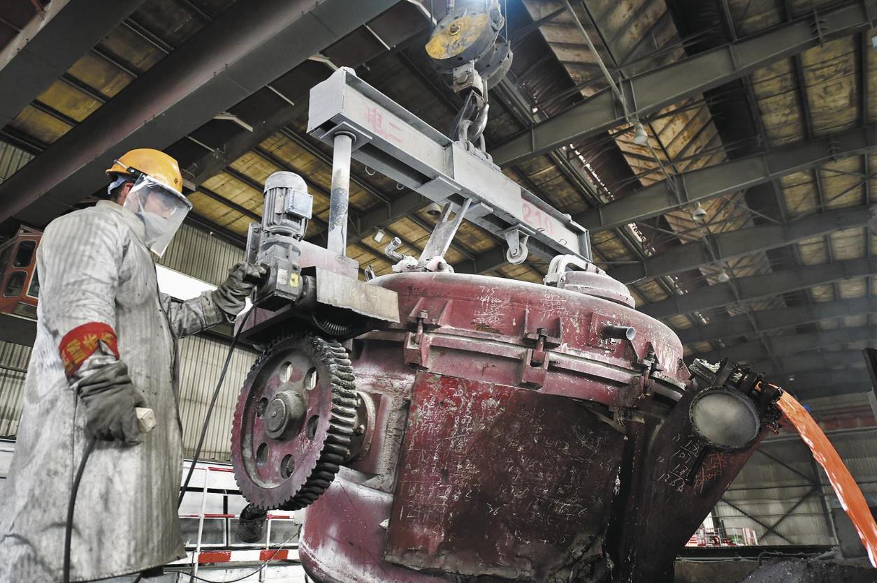 青海橋頭鋁電股份有限公司熔鑄廠內(nèi),工作人員正在往混合爐傾倒鋁液,生產(chǎn)區(qū)一派繁忙景象。