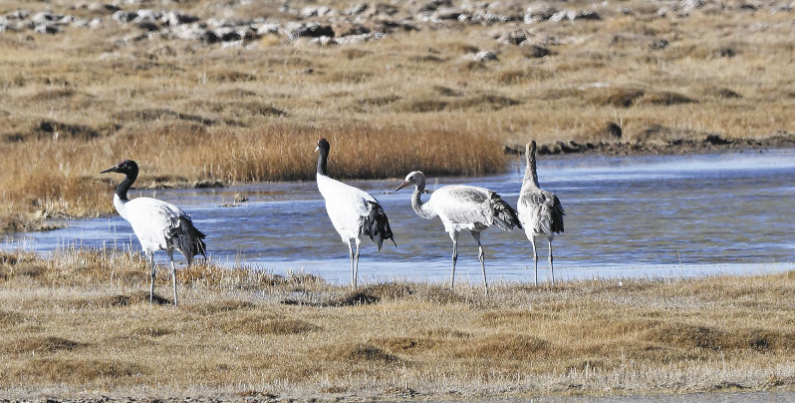 青海湖畔的濕地是鳥類的天堂。黑頸鶴在淺水中優(yōu)雅踱步,修長脖頸劃出水墨般的曲線。斑頭雁群掠過水面,黑白羽翼攪碎云影,驚起層層疊疊的碧浪。當(dāng)暮色浸染草原,藏狐帶著幼崽在鼠兔洞前駐足,金黃皮毛融進夕照,天地間奏響生生不息的交響。
