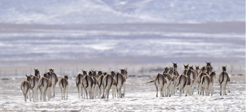 可可西里的荒原上,藏羚羊群踏碎寒霜。它們細(xì)長的四肢掠過荒原,金棕色絨毛在風(fēng)中泛起漣漪,宛如流動的琥珀。雄性藏羚羊頭頂?shù)年鹘莿澠葡”】諝猓诤0?000米左右的高處書寫著生存的倔強。牧民帳篷旁,藏野驢揚起雪塵奔跑,脖頸鬃毛如同飄動的經(jīng)幡,與天際線處終年不化的冰川遙相呼應(yīng)。