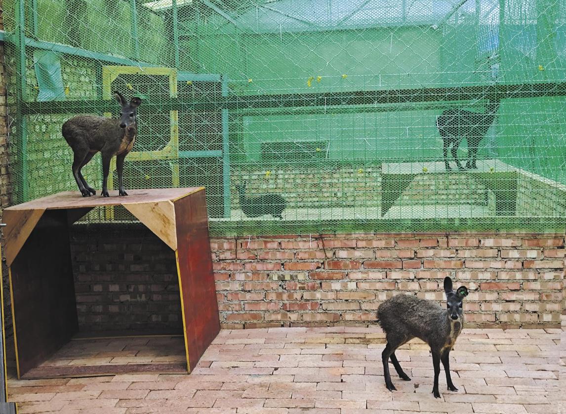消了毒、戴好口罩后,記者進到林麝溫棚,距離溫棚大門不遠處用鐵絲網制作的一間小房里,一只只林麝或悠然進食,或跳躍玩耍,或安然靜臥。