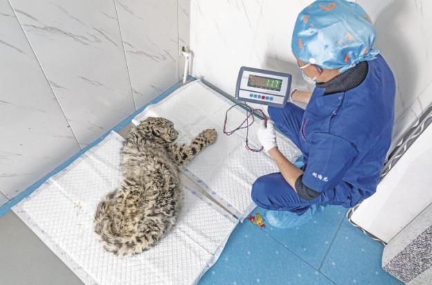 3月5日,青海野生動物救護繁育中心接到一只來自玉樹藏族自治州治多縣索加鄉的瀕危雪豹幼崽。經過檢查發現,該雪豹幼崽為雄性,體長74厘米,體重9.7千克,據此判斷只有6個月左右大,是一只2024年9月后出生的異常個體。工作人員檢查得知,該雪豹幼崽出現嚴重脫水、消瘦,初測體溫僅為36.6℃(正常參考范圍:37.7℃—39.5℃),明顯低于正常水平,已經處于瀕死狀態。