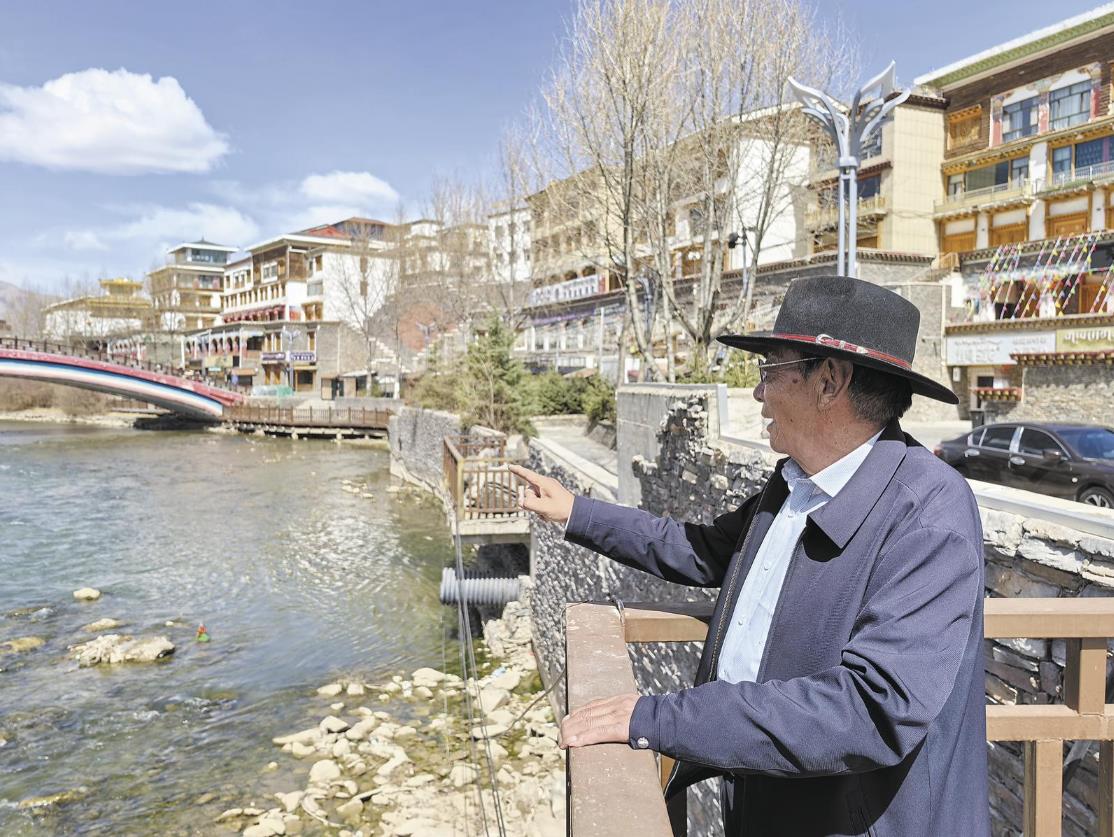 2002年,從雜多縣退休后,東永拉巴和一家人就回到了格下社區,盡管今年已經83歲高齡,但東永拉巴腿腳靈便,每天到河邊散步已成為他的習慣。漫步在河岸綠道,東永拉巴精神頭很足,走上一截他便像生態管護員一般放慢腳步低頭端詳。