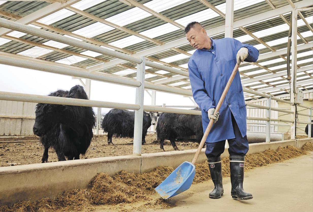 4月22日清晨,走進海東市平安區富硒牦牛產業示范園區,標準化鋼結構的養殖大棚鱗次櫛比地坐落在山腰上,在養殖區2號棚內,身著藏藍工作服的飼養員正給牦牛投喂科學配比的飼草料,現代化的養殖大棚干凈整潔,圈舍內膘肥體壯的牦牛群悠閑咀嚼飼草,油亮的黑色毛發在晨光中泛著光澤。據了解,該園區共占地面積1225畝(1畝約0.067公頃),園區內現有高標準牦牛養殖棚圈66棟,可同時容納1萬頭牦牛的養殖,是目前青海省最大的富硒牦牛產業基地。目前,園區運營工作由青海華豐高原富硒農產品開發有限公司負責,采用“集中管理,分戶經營”的運營模式,并通過土地流轉、飼草種植加工帶動、入園養殖、靈活就業、利潤分紅等,不斷帶動周邊農戶創收增收。