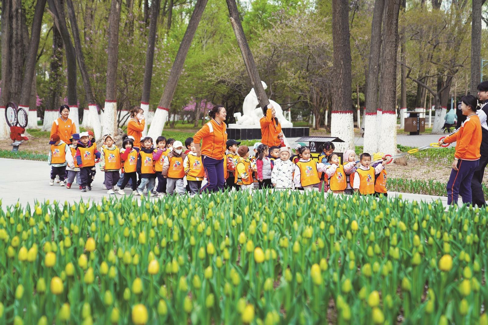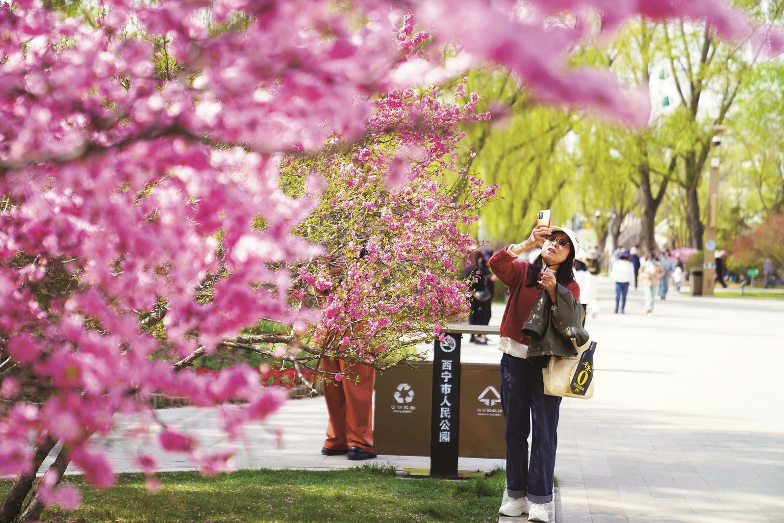 青海新聞網·江源新聞客戶端訊 4月24日,清晨的陽光穿過樹葉的間隙,在街道上投下斑駁的光影。街道兩旁的行道樹透著翠綠,枝條隨清風搖擺,新綠讓人心醉。西寧市人民公園里綠意正濃,幾名操著外地口音的游客,在綠地旁的花下拍照留影。