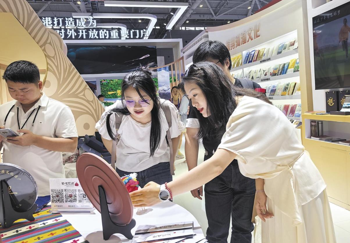 歌舞漸歇,觀展的游客陸續(xù)走進(jìn)了青海主題館,開啟了一場(chǎng)關(guān)于河湟文化的奇妙之旅。游客的目光,被青海主題館各個(gè)展位上的產(chǎn)品所吸引。在青海贊檀花開文創(chuàng)開發(fā)有限公司的展位上,田玉蓉時(shí)而整理著展臺(tái)上的文創(chuàng)產(chǎn)品,時(shí)而給好奇的顧客介紹著產(chǎn)品。“這是用什么工藝制作的?看著好精致啊。”一位游客指著展臺(tái)上一件制作精美的擺件詢問。“這件九龍御瑞掐絲盤,采用的是傳統(tǒng)的掐絲技藝。”田玉蓉介紹。在田玉蓉的介紹下,游客拿起掐絲盤細(xì)細(xì)欣賞,驚嘆連連。在他們的展位上,還有一些羊毛氈文創(chuàng)產(chǎn)品。羊毛氈工藝歷史悠久,是通過對(duì)羊毛進(jìn)行戳刺、塑形等處理,使其氈化成型。這些羊毛氈文創(chuàng)產(chǎn)品造型可愛,色彩豐富,其中有一只類似動(dòng)畫形象肖恩的小羊,身上裝飾著多彩毛球,是一件非常可愛的家居飾品。“我們的羊毛氈文創(chuàng)產(chǎn)品的制作技藝是源自果洛州的羊毛氈技藝。我們希望將更多的非遺文化帶入現(xiàn)代生活,也讓更多的人了解青海的非遺文化。”田玉蓉說。
