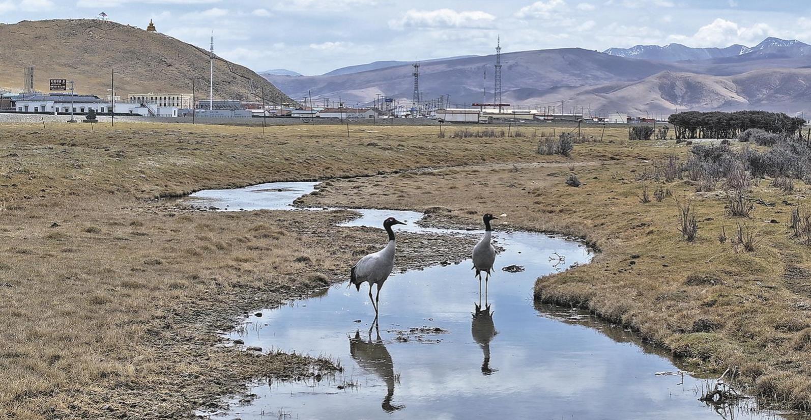 艷陽高照,央隆濕地公園浮冰初融的湖面上,兩聲穿透霧靄的鳴叫宣告著高原春信。黑頸鶴夫婦將細喙直指蒼穹,時而以環形舞步觸碰彼此羽尖,這場求偶儀式恍若天地見證的婚禮。