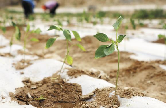 記者在現(xiàn)場看到,兩名務工人員手持地膜打孔器在壟膜上打孔挖穴,其他人員手握辣椒苗,兩人一壟行,動作嫻熟地逐穴栽苗定植。