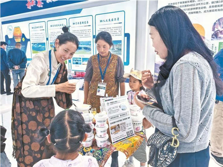 在同德縣展區(qū),濃郁醇厚的奶香味吸引著過往的市民游客。一張質(zhì)樸的小圓桌上,包裝各異的純牦牛酸奶擺放整齊,同德縣崗日梅朵牦牛乳制品有限公司負責人央宗身著傳統(tǒng)民族服飾,笑容熱情而親切。