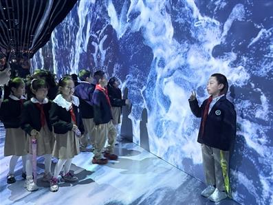 踏入以海洋主題構建的數字空間里,學生們瞬間被“生命之海”“文明之海”“現實之海”“時間之海”“觀念之海”五大展區所吸引。在“生命之海”展區,栩栩如生的全息魚群在光影的交錯中游弋,仿佛置身于真實的海底世界;在“文明之海”展區,人工智能實時生成的藝術圖景隨著孩子們的筆觸靈動變幻,展現出科技與藝術的完美融合。巨幕裸眼3D效果帶來的視覺震撼,讓孩子們連連驚嘆,仿佛穿越時空,探索著海洋的奧秘。互動感應裝置精準響應孩子們的肢體語言,讓他們在與光影的“對話”中,感受到了前所未有的互動樂趣。學生們簇擁在講解員身旁,或專注聆聽海洋知識科普,或伸出手指與變幻的光影進行“對話”,或湊近屏幕觀察紋理細節。