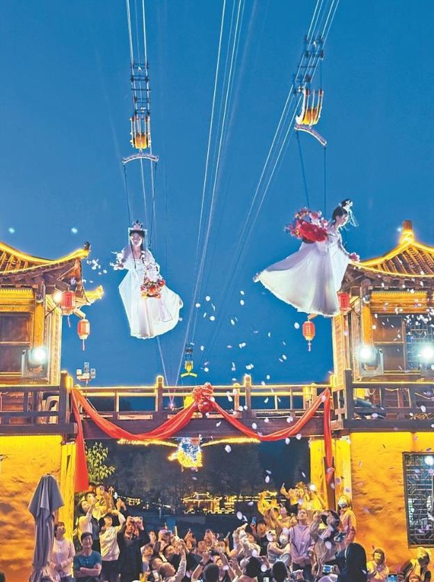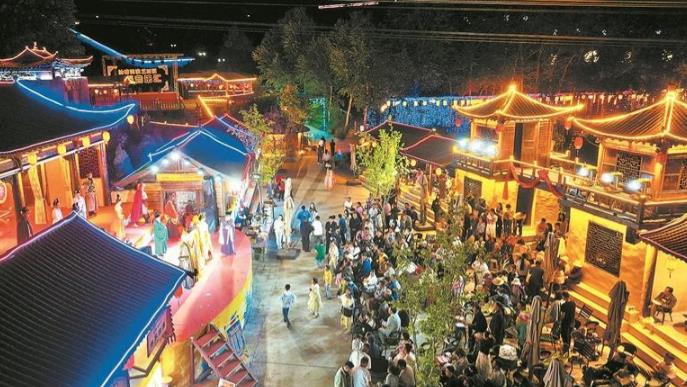盛夏,夜幕下的青海海東市互助土族自治縣油嘴灣生態(tài)文化景區(qū)燈火璀璨,游客如織。燒烤攤的煙火氣、民俗演藝的歡笑聲交織升騰。這燈火通明、人聲鼎沸的“不夜村”讓“夜經(jīng)濟(jì)”蓬勃發(fā)展,實(shí)實(shí)在在地充盈了村民的腰包。夜經(jīng)濟(jì)如同一束光,照亮油嘴灣從“荒山”到“金山”的轉(zhuǎn)型之路,更讓鄉(xiāng)村振興的希望,在村民的笑容中悄然生長(zhǎng)。圖為演藝現(xiàn)場(chǎng)。李娜 魏雅琪 攝