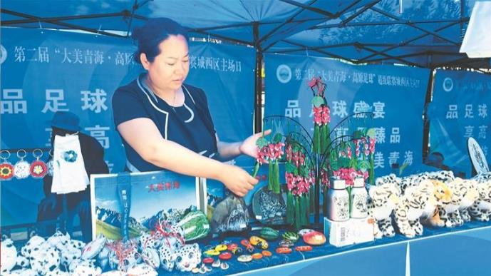 移步非遺展區,城西區堆繡區級傳承人黨占紅正舉著巴掌大的手繪石頭畫介紹,她和研發團隊研發的文創產品里,刺繡掛件繡著雪豹,手提包印著“青超聯賽”字樣,這些融著賽事元素的老手藝新物件,被游客攥在手里舍不得放下。這是她們第二次站上“青超聯賽”的舞臺,展位前不時響起的掃碼支付提示音,正是銷量與知名度雙升的最好證明。