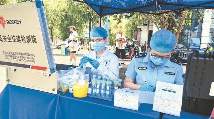 美食區的煙火氣里,一抹“監管藍”格外醒目。城西區市場監督管理局快檢中心的李鈺和同事正在現場開展食品檢測,從蔬菜水果的農殘篩查,到食用油的酸價和過氧化值檢測,再到調料中的罌粟測試,每一項都透著細致。李鈺介紹:“13個批次的抽檢樣品全部合格,為了讓市民吃得踏實,商家賣得安心。”
