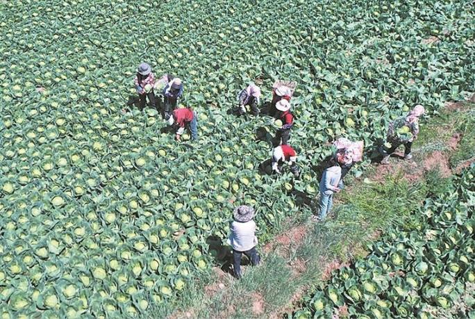 蔬菜基地的田間道路上,一臺農(nóng)運(yùn)貨車正在裝車甘藍(lán)。