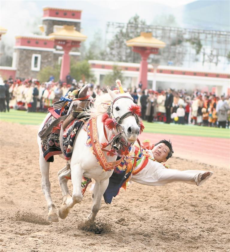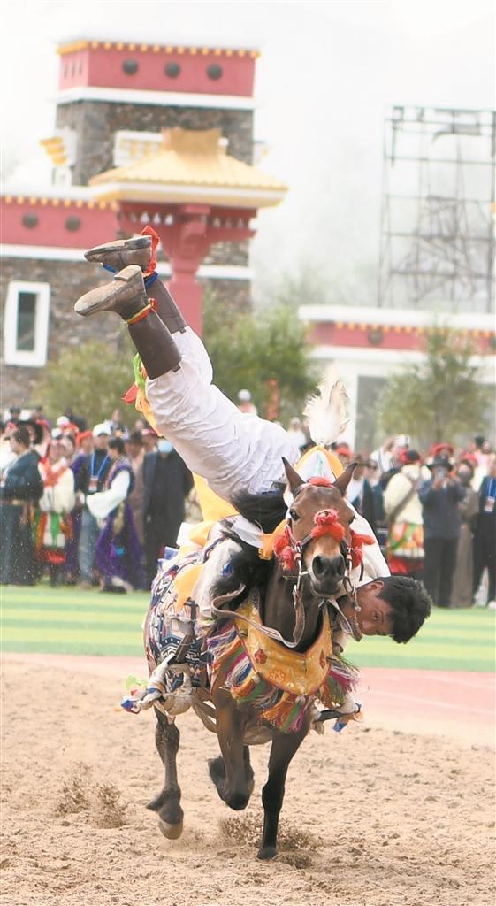 西然吾賽說(shuō):“玉樹(shù)賽馬會(huì)比賽主要包括跑馬賽、走馬賽、牦牛賽等項(xiàng)目。而開(kāi)幕式現(xiàn)場(chǎng)參賽選手帶來(lái)的乘馬射擊、乘馬拾哈達(dá)、乘馬倒立等則是觀賞度極高的馬術(shù)表演。這些表演項(xiàng)目對(duì)選手的騎乘能力有著極高的要求,選手需在奔馬背上穩(wěn)如磐石,身體懸空時(shí)如雄鷹展翅,倒立瞬間似青峰拔地,真的是臺(tái)上一分鐘臺(tái)下十年功。”