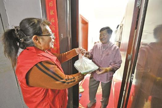 錦繡江南幸福食堂助餐員王艷,為腿腳不便的侯玉梅老人提供送餐服務。