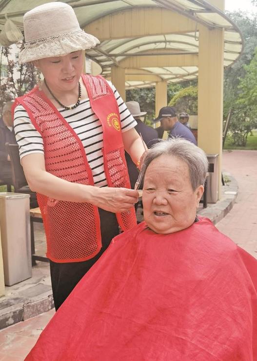 西寧市城西區溫馨陽光托老所居家養老服務工作人員為老人理發。