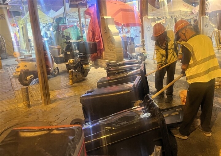 8月2日晚,下南關(guān)夜市人來(lái)人往,香氣四溢。來(lái)自西安的旅客陳女士穿梭在攤位間,一邊品嘗特色小吃,一邊感慨:“本以為夜市人多會(huì)臟亂,沒(méi)想到這里地面干凈,垃圾桶也清清爽爽,逛著太舒心!”她看到兩位身著環(huán)衛(wèi)工作服、頭戴安全帽的環(huán)衛(wèi)工人正仔細(xì)刷洗垃圾桶,工具揮動(dòng)間,污漬被逐一清除,桶身重現(xiàn)潔凈,此時(shí)已是晚上9時(shí)。這一幕,讓陳女士忍不住用手機(jī)記錄,“這些環(huán)衛(wèi)師傅太負(fù)責(zé)了,有他們?cè)冢故械臒熁饸饫锒嗔朔葑屓税残牡恼麧崱?rdquo;