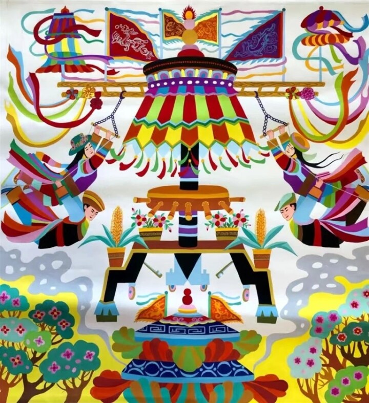 為繁榮鄉村文化、助力鄉村振興,由文化和旅游部公共服務司與中國國家博物館聯合主辦的“大地繪彩——2025年農民畫大展”將于2025年10月在中國國家博物館舉行。該展覽旨在推動優質文化資源服務基層,培育文明鄉風。青海省美術家協會民間藝委會與西寧市美術家協會積極動員會員創作,經嚴格遴選,來自大通縣和湟中區的10幅優秀農民畫作品脫穎而出,成功獲得報送資格并通過初評,進入全國復評。其中,朱錦明創作的《高原社火頌華年》以青藏高原河湟民間社火文化為創作主題,通過概括和提煉社火重要角色和著裝色彩,如舞龍、舞獅、太平鼓、燈官、傻公子、大姑娘和不可或缺的啞巴、胖婆娘等,表達新時代農村振興文化的濃厚氣息和幸福生活、人民安康的感恩情懷。該作品的繪畫工藝在傳統農民畫的基礎上,運用品質較高的畫材和顏料,人物形象和道具平面裝飾中富有寫實、夸張的手法,致力于更好地塑造畫面氣息,把高原人民的豐富美感呈現給觀眾。而朱廣芬創作的《輪子秋》是流行于青海互助土族自治縣的傳統體育活動,屬于國家級非物質文化遺產之一。土族輪子秋,土族語稱為“卜日熱”,意為旋轉,即轉輪輪。每年正月農忙過后,土族青年們將大板車改裝成融秋千、轉盤為一體的吊車,兩名身著彩裝的姑娘在上面飛旋起舞。為求一年神清氣爽,男女老幼在“輪子秋”上轉一轉已成習俗,技藝高超者還能做出高難度的雜技動作。2008年6月7日,土族輪子秋經國務院批準列入第二批國家級非物質文化遺產名錄。