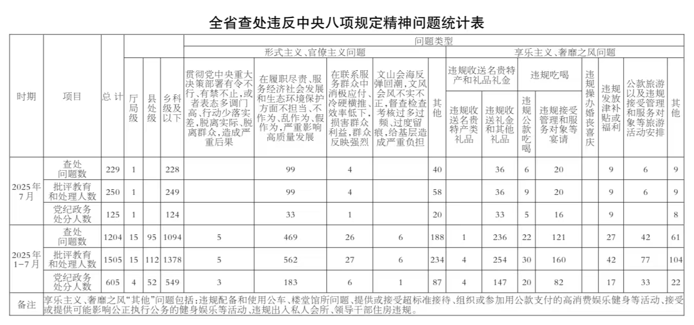 1月至7月,全省共查處違反中央八項規定精神問題1204起,批評教育和處理1505人,給予黨紀政務處分605人。其中,查處形式主義、官僚主義問題694起,批評教育和處理834人,給予黨紀政務處分280人;查處享樂主義、奢靡之風問題510起,批評教育和處理671人,給予黨紀政務處分325人。