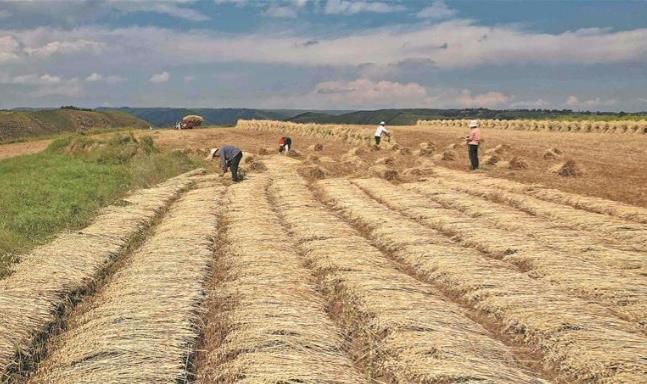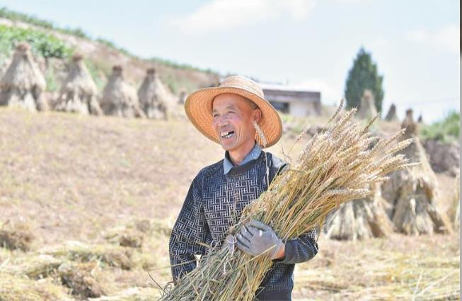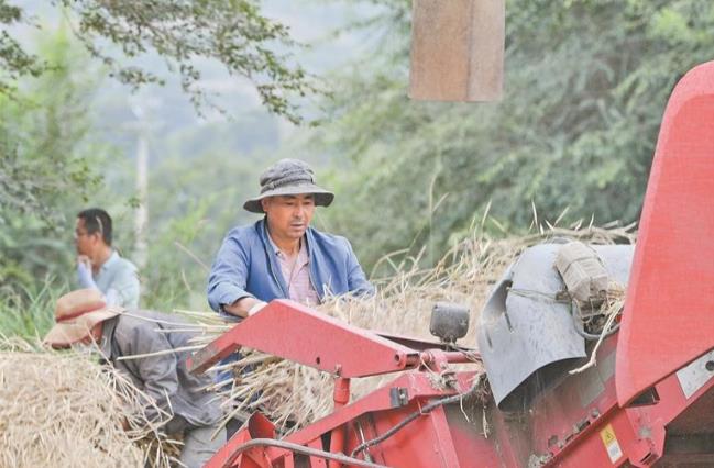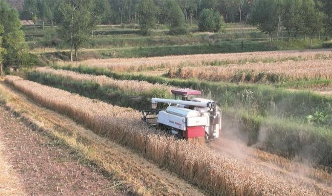 一望無際的田野間,金黃麥浪隨風起伏,與層層疊疊的梯田相映成趣。田野里,收割機往來穿梭,轟鳴聲中成片作物被快速收割脫粒;不遠處的小塊田壟上,鄉親們手持鐮刀,彎腰揮臂收割成熟的麥子——傳統農耕的細致與現代農機的高效交織,勾勒出如詩如畫的豐收圖景。