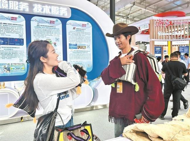 展區(qū)內(nèi),古樸繁復(fù)的藏族飾品、簡約時尚的牦牛毛手提包、色彩艷麗的羊皮襖等極具民族風(fēng)情的展品錯落擺放,不同風(fēng)格相互碰撞,盡顯地域特色與創(chuàng)新活力。展臺前,來自全國各地的參展商、嘉賓,有的駐足觀賞,輕輕撫摸飾品上的精細(xì)紋飾;有的拿起包袋,細(xì)細(xì)感受其中的設(shè)計巧思,這里成了服貿(mào)會上人氣頗高的“打卡點(diǎn)”。