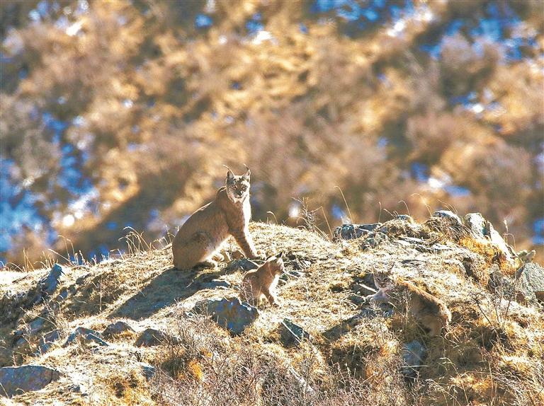 猞猁一家三口——“那是2021年11月,我正在麥尼溝放牧。剛爬上山坡,就注意到對面山頭上有一個(gè)身影,仔細(xì)一看,竟是只猞猁。我立刻停下腳步,迅速給相機(jī)裝上長焦鏡頭,透過鏡頭仔細(xì)觀察。原來那是一只猞猁媽媽,身邊還緊跟著幼崽,它們安靜地趴在山頂。我屏住呼吸,連續(xù)拍攝了幾張。”