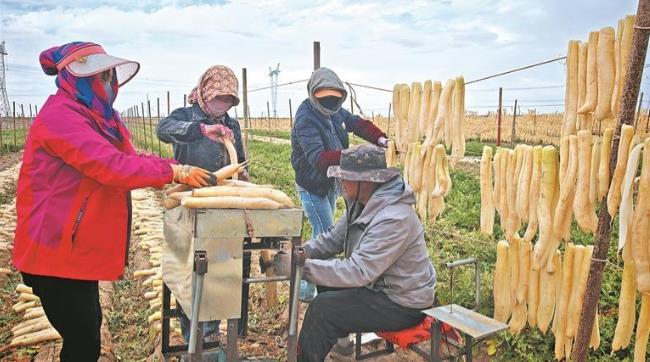 9月26日,在青海省海西蒙古族藏族自治州都蘭縣宗加鎮的蘿卜種植基地里,翠綠的蘿卜葉隨風輕搖,雪白的蘿卜條掛滿晾曬架,田間地頭穿梭著工人們忙碌的身影,他們或切條、或翻曬、或裝運,歡聲笑語交織出一幅柴達木盆地秋收的壯美圖景。據了解,都蘭縣依托地域廣闊、氣候干燥及高山溫差優勢,發展短周期、高產量的蘿卜產業。從2022年起,宗加鎮通過荒漠土地復墾,推廣標準化種植與長美大根優質蘿卜品種,產品遠銷國內其他省市及日韓市場,帶動200余人就業增收60余萬元,有效助力鄉村振興。