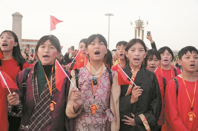 9月26日,在天安門廣場(chǎng),瑪多縣學(xué)生齊唱國歌,觀看升國旗儀式。