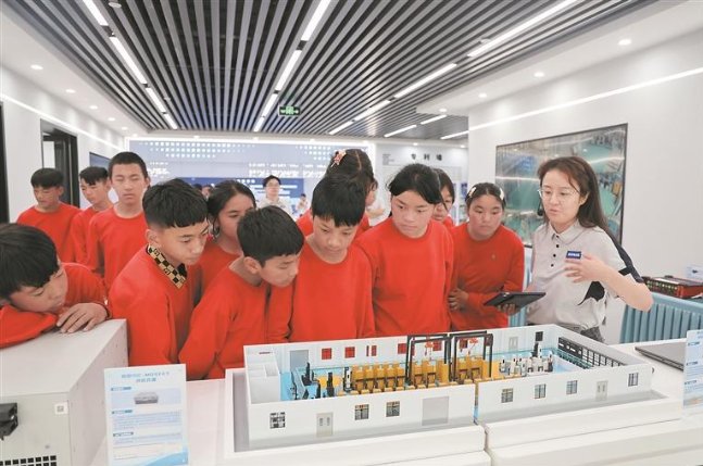 9月28日,瑪多縣學(xué)生在國網(wǎng)北京電科院國網(wǎng)級(jí)實(shí)驗(yàn)室參觀通州牛堡屯充電設(shè)施自動(dòng)檢驗(yàn)檢測(cè)流水線模型。國網(wǎng)果洛供電公司供圖