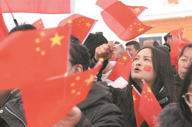 10月1日10時01分,國歌在海拔3800米的拉脊山奏響,鮮艷的五星紅旗迎著風雪緩緩升起,歌聲在群山間環繞。由三江源生態保護基金會發起的此次“日出云海映國旗·守護江源慶華誕”國慶主題公益活動,吸引了近百人參加。活動現場,《我和我的祖國》《歌唱祖國》等一首首紅歌與風雪交織,在拉脊山頂回蕩。記者 李興發 攝