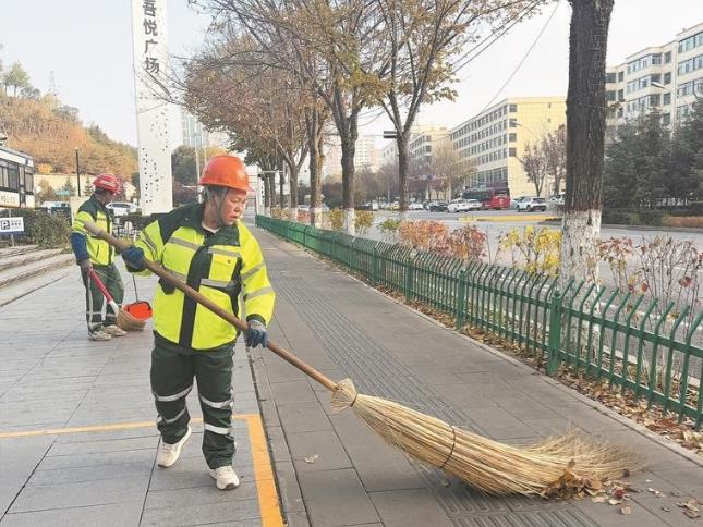 青海新聞網·江源新聞客戶端訊 10月15日6時,西寧市城北區在逼近零攝氏度的寒氣中緩緩醒來。吾悅廣場前的人行道上,祁成蘭頭戴橙色安全帽,一身黃綠相間的工作服在晨霧中格外醒目。她揮動著掃帚,動作沉穩有力,落葉隨著她嫻熟的節奏聚攏成堆,發出沙沙的輕響,像秋天最樸素的低語。