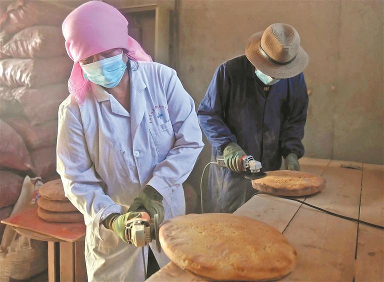 面坯被埋進(jìn)高溫的高嶺土中,靜靜等待蘇醒。烈火舔舐,高溫滲透,原本白生生的面坯,漸漸褪去生澀,披上一身金黃。待到“出土”時(shí),更尕卓瑪用打磨機(jī)輕磨饃面,泥土與焦皮簌簌落下,露出細(xì)密溫潤的紋路——像極了腳下這片被黃河水沖刷了千年的土地。